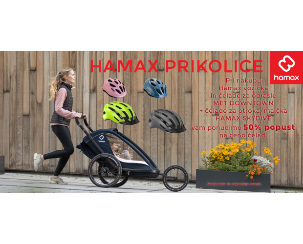 Pri nakupu prikolice Hamax in čelade za odrasle MET DOWNTOWN ter čelade za malčke HAMAX SKYDIVE, vam ponudimo 50% popust na cene čelad.